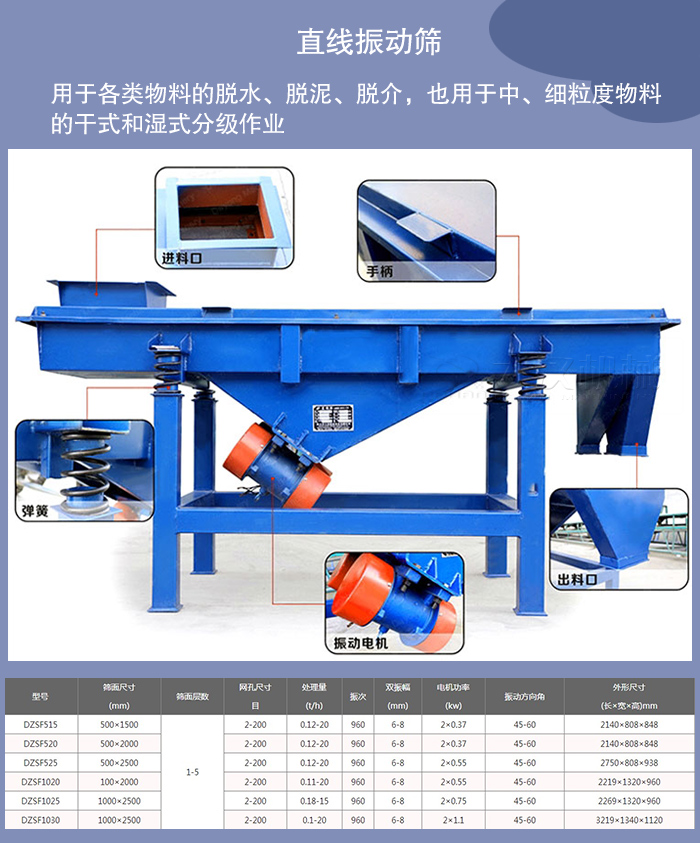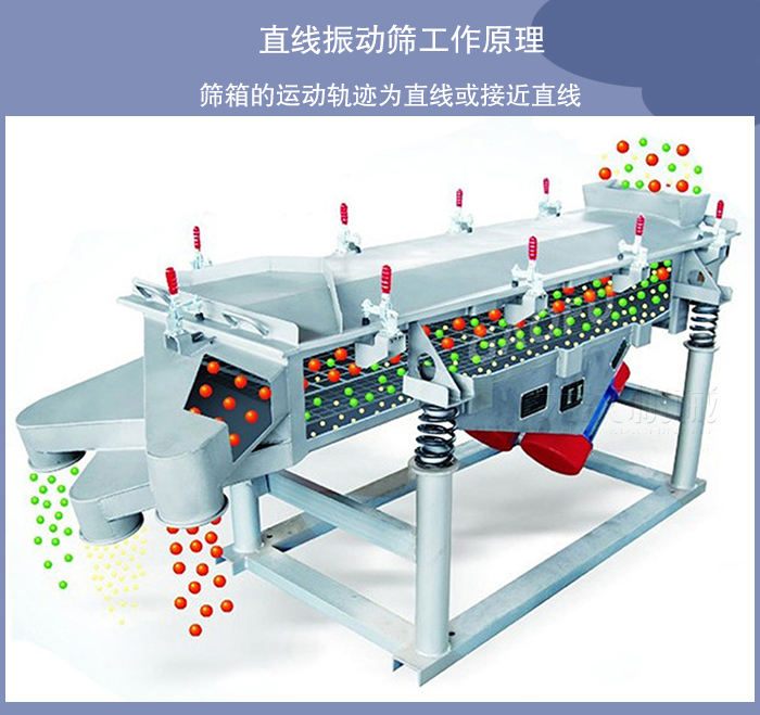 直線振動篩篩箱的運動軌跡為直線或接近直線,它有兩個軸,所以又稱雙軸振動篩。直線振動篩水平或傾斜安裝,這類振動篩結構緊湊,運行平穩(wěn),被廣泛用于各類物料的脫水、脫泥、脫介,也用于中、細粒度物料的干式和濕式分級作業(yè)。我廠生產(chǎn)的直線振動篩種HZSF型號就是直線振動篩代表性的產(chǎn)品。