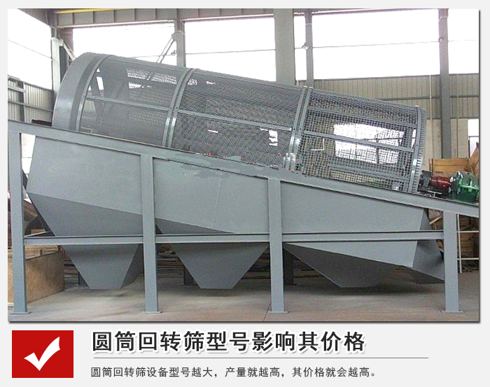 不同型號(hào)的圓筒回轉(zhuǎn)篩,其篩孔、產(chǎn)量是不同的,所以價(jià)格也會(huì)有所影響。圓筒回轉(zhuǎn)篩型號(hào)從YTS1030-YTS2060,其產(chǎn)量必然也是隨之增加的。圓筒回轉(zhuǎn)篩設(shè)備型號(hào)越大,產(chǎn)量就越高,其價(jià)格就會(huì)越高。(附參數(shù)表)