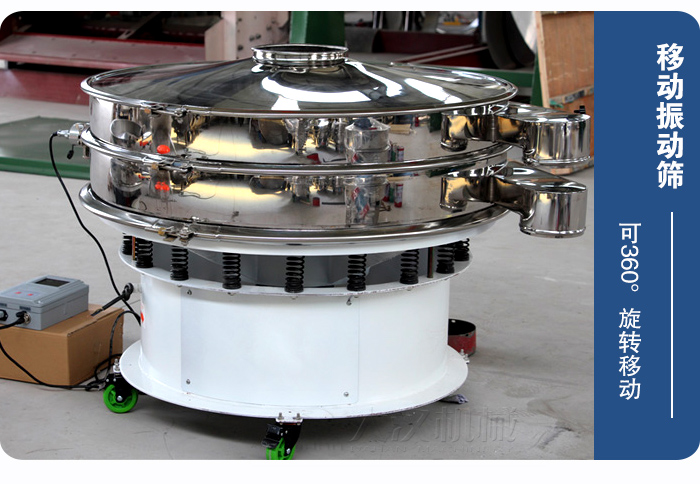 該設備底部加裝萬向旋轉輪,可360°旋轉移動,所以稱之為:移動振動篩