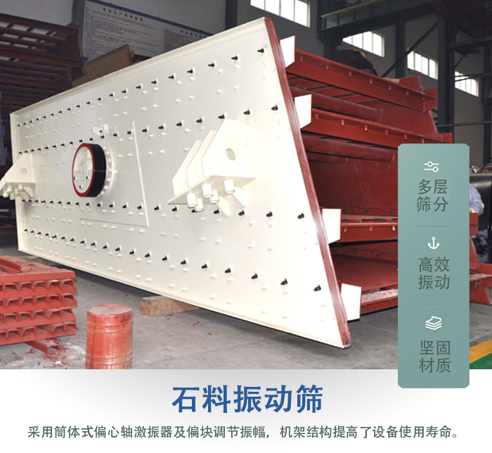 大漢機械生產的石料振動篩設備改良傳統振動篩結構采用筒體式偏心軸激振器及偏塊調節振幅,鉚釘連接裝配式機架結構提高了設備使用壽命及彈簧減振裝置減小了對基礎的沖擊力。