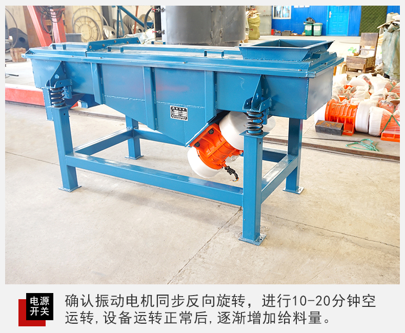 3、閉合電源開關,確認振動電機同步反向旋轉,進行10-20分鐘空運轉,設備在運行時如有異常聲音,應迅速關機進行檢查處理。設備運轉正常后,可將少量需篩分的物料通過進料口設入篩機內,確認物料向出料口方向行進,然后逐漸增加到所需和所能承受的給料量。