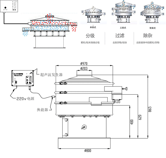超聲波振動(dòng)篩是在原有的電機(jī)帶動(dòng)振動(dòng)篩振動(dòng)的基礎(chǔ)上,增加了超聲波系統(tǒng)。振動(dòng)篩堵網(wǎng)的問題是制約篩分效率的關(guān)鍵,堵網(wǎng)問題解決了,其他問題就迎刃而解.超聲波裝置是由超聲波電源通過換能器將超聲波轉(zhuǎn)換為每秒37000次的高頻機(jī)械波作用于篩網(wǎng)表面。來起到清理篩網(wǎng)的作用。解決了由于篩孔上的靜電附著力,粉末的凝聚作用和插入粗糙網(wǎng)絲表面的微粒而造成的堵塞問題。提高了篩分效率。